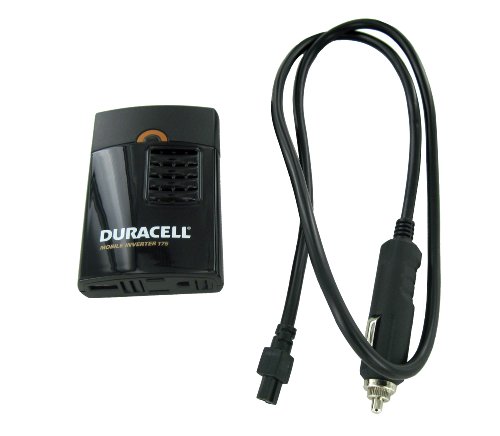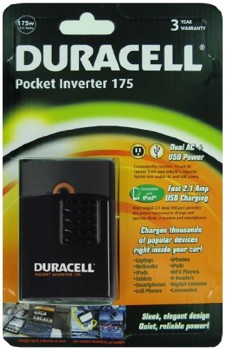 The Duracell 175W pocket inverter converts 12-volt DC battery power from a vehicle into up to 175 watts of usable AC and USB electricity. This sleek, compact adapter includes a three-prong household AC outlet and a fast 2.1-amp USB charge port, allowing you to operate and recharge a larger range of mobile devices. The pocket inverter is powerful enough to handle higher-output electronics such as a TV/VCR combo or work light, and can simultaneously run and charge both an AC and USB device at once, including iPads/tablet PCs, laptops, netbooks, e-readers, smartphones and many other devices for ultimate charging convenience. The Duracell pocket inverter is ideal for any purpose, from your mobile computing to recreational use. As one of the smallest inverters on the market, it stores easily in your laptop bag, vehicle console or glove box, and its advanced cooling technology ensures a perceived noise level that is up to 50 percent quieter.