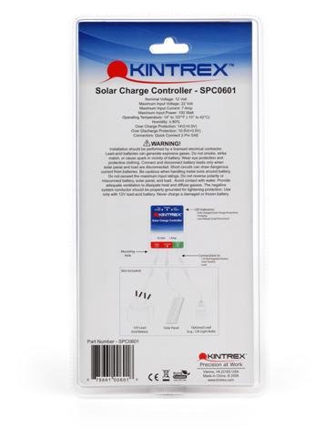 The SPC0601 Solar Charge Controller is designed to protect batteries from overcharge and excessive discharge when being charged by a solar panel device. The controller functions to automatically assure the battery is fully charged and keep the battery fully charged without damage to the battery. The SPC0601 Charge Controller also functions to limit the load placed upon the battery to ensure the battery is not discharged to the point where there is permanent damage to the battery. The SPC0601 is a completely solid state electronic device needing no maintenance. It utilizes the latest in solid state MOSFET switching for efficient and reliable operation. The controller provides three colored LEDs to indicate the status of the solar panel and battery: Green LED: On indicates the battery is fully charged. Yellow LED: On indicates the battery is charging. Note: It is normal for the Green and Yellow LEDs to flicker back and forth during normal operation. Red LED: On indicates the battery level is low.